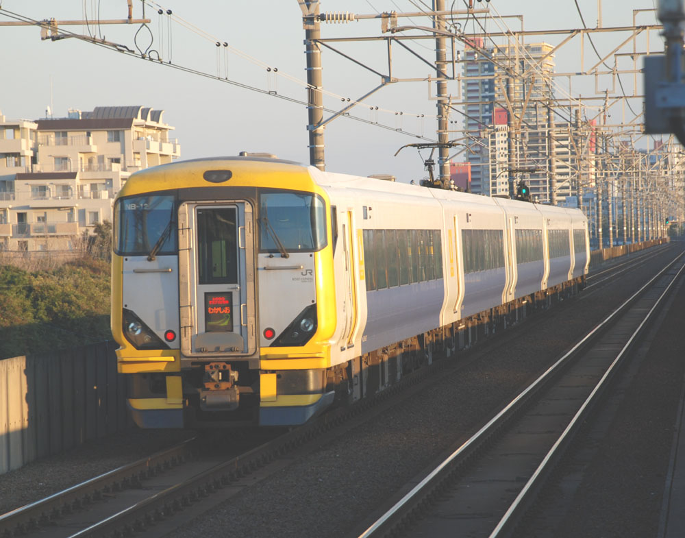 -(150 KB)夕陽を浴びて東京を目指す快速列車。