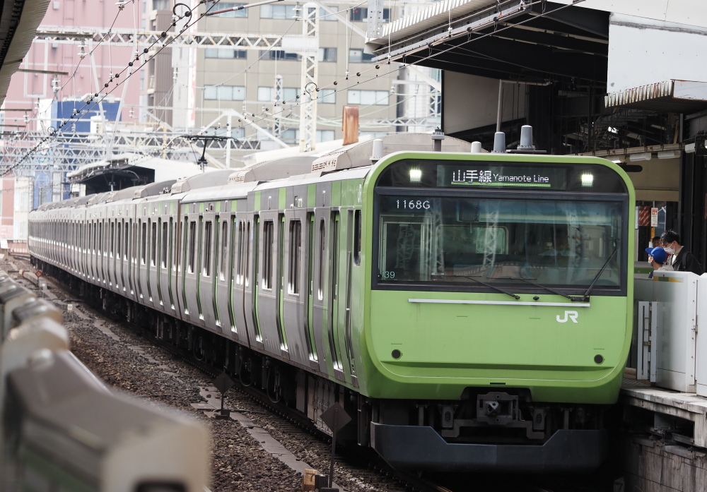 Netflixがジャックした「黒い山手線」E235系15編成、「鉄道150年」のヘッドマーク付〔2022.12.19撮影 / 恵比寿駅〕