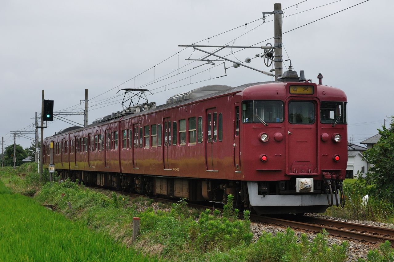 今年は電化20周年ということで地元とタイアップして色々なイベントが計画されているようですが、415系にもいろいろな変化が見られます。その1 茜色地域色として採用された茜色に塗り替えられた編成もだんだん増えて半数を超えたとのことです。施工が早かった編成では塗装の光沢が少なくなってきていて光線の加減では旧国鉄の交直流色に見えます。前面に幅広のクリーム色の帯をつければ完璧ですね。 津幡〜中津幡 間にて