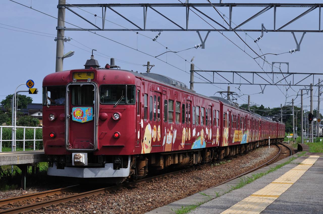 ラッピング編成 和倉温泉わくたま号(C08編成)「能登ふるさと博」にあわせて「七尾線電化開業20周年記念事業」として7月1日から9月30日まで運行されます。「・・わくたま号」は和倉温泉のマスコットキャラクター「わくたまくん」を描いたものですが、他に「七尾とうはくん号」と「UFOのまち羽咋号」の2本があります。 835M 敷浪駅にて