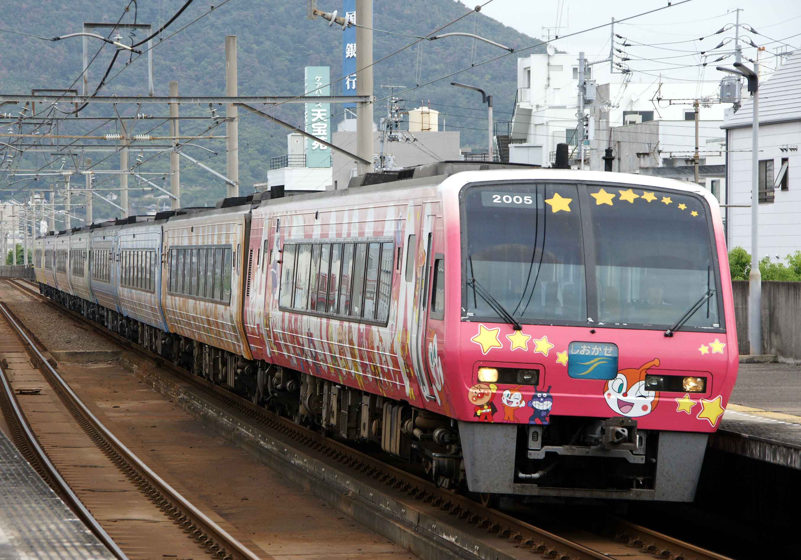 ドキンちゃん号を先頭にした特急しおかぜ。8両編成中7両がアンパンマンラッピングで、予讃線バージョン11両のうち7種類を見ることができました。2009年9月22日 丸亀