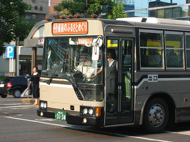 -(82 KB)秋田県大館市を拠点とする秋北バス。市内線はこの塗色が一般的ですが、緑を基調とした新色車も若干います。