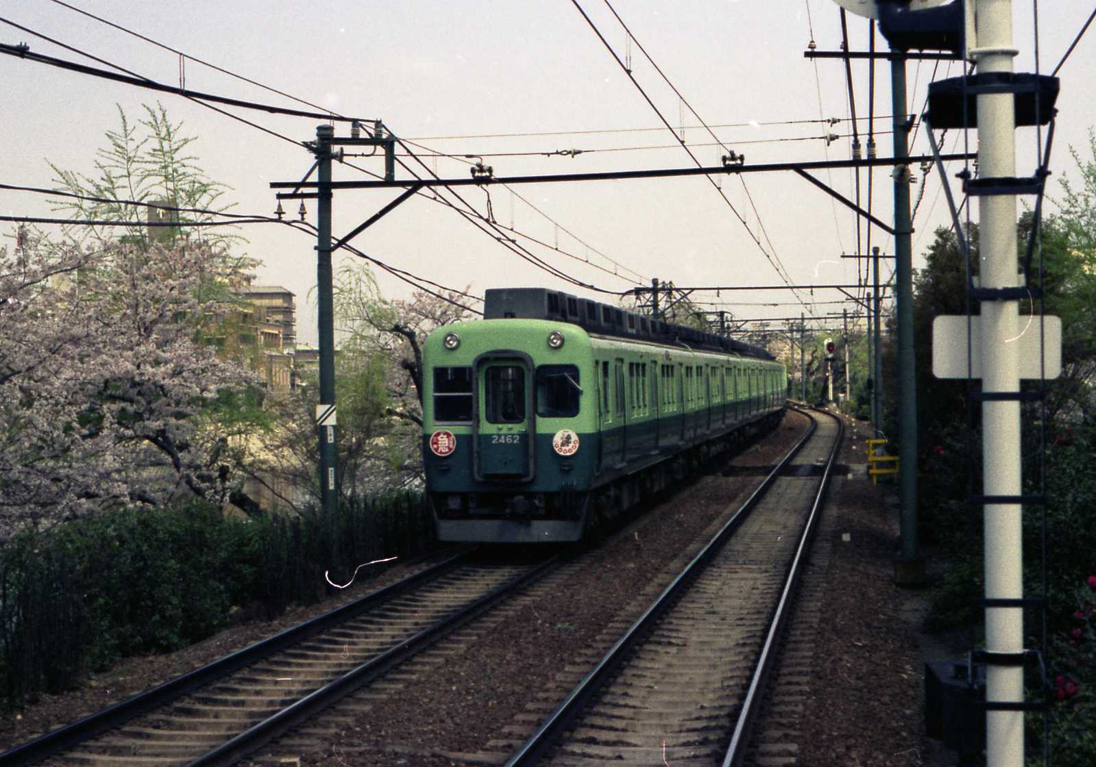 -(56 KB)今では付いてて当たり前の冷房ですが、万博直後に関西大手各社が競って新造したものが普及した原点だったように思います。昔から研究熱心で知られた京阪では2400を投入。2200に酷似した車体ながらシールドビームで小型化された前照灯や背の高い独特のクーラーキセが印象的でした。3000登場直後の撮影ですが、この画には幌枠が無く随分違和感を感じたものです。これがノーマルだったのか?それともイレギュラーだったのか?昭和46年夏、野江で。