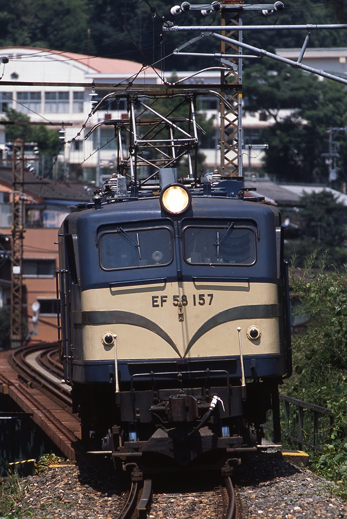 -(80 KB)朝日を浴びて走るEF58 157号機。