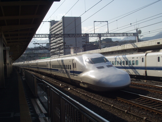 写真の700系より先頭が1.5m長いN700系は最高時速が300km/hになり、250km/hまでしか出せなかった東海道区間のカーブも270km/hで曲がれるようになります。