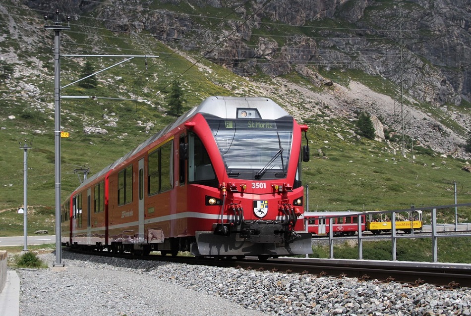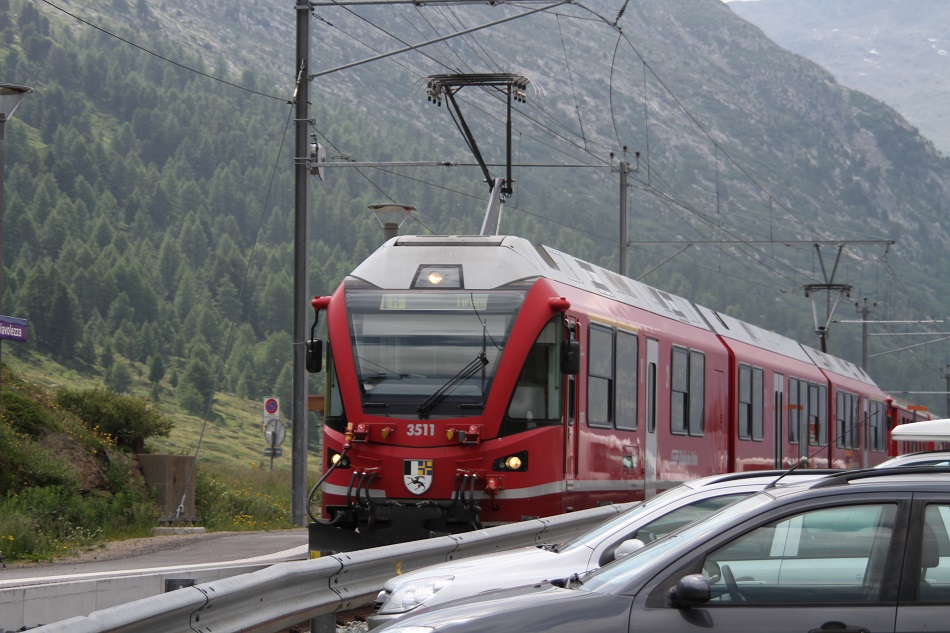 レンタカーで走行中、小さな駅を見つけました。スイス人?や日本のツアー客が結構いたので、ツアー客に「列車が来るんですか?」と尋ねると「間もなく上下の列車が来るらしいですよ」と教えてくれたので、車から降りて列車を待ちました。やって来たのは上下のベルニナ急行で、走行中の姿をとらえる事が出来ました。この画像はサンモリッツ駅行き