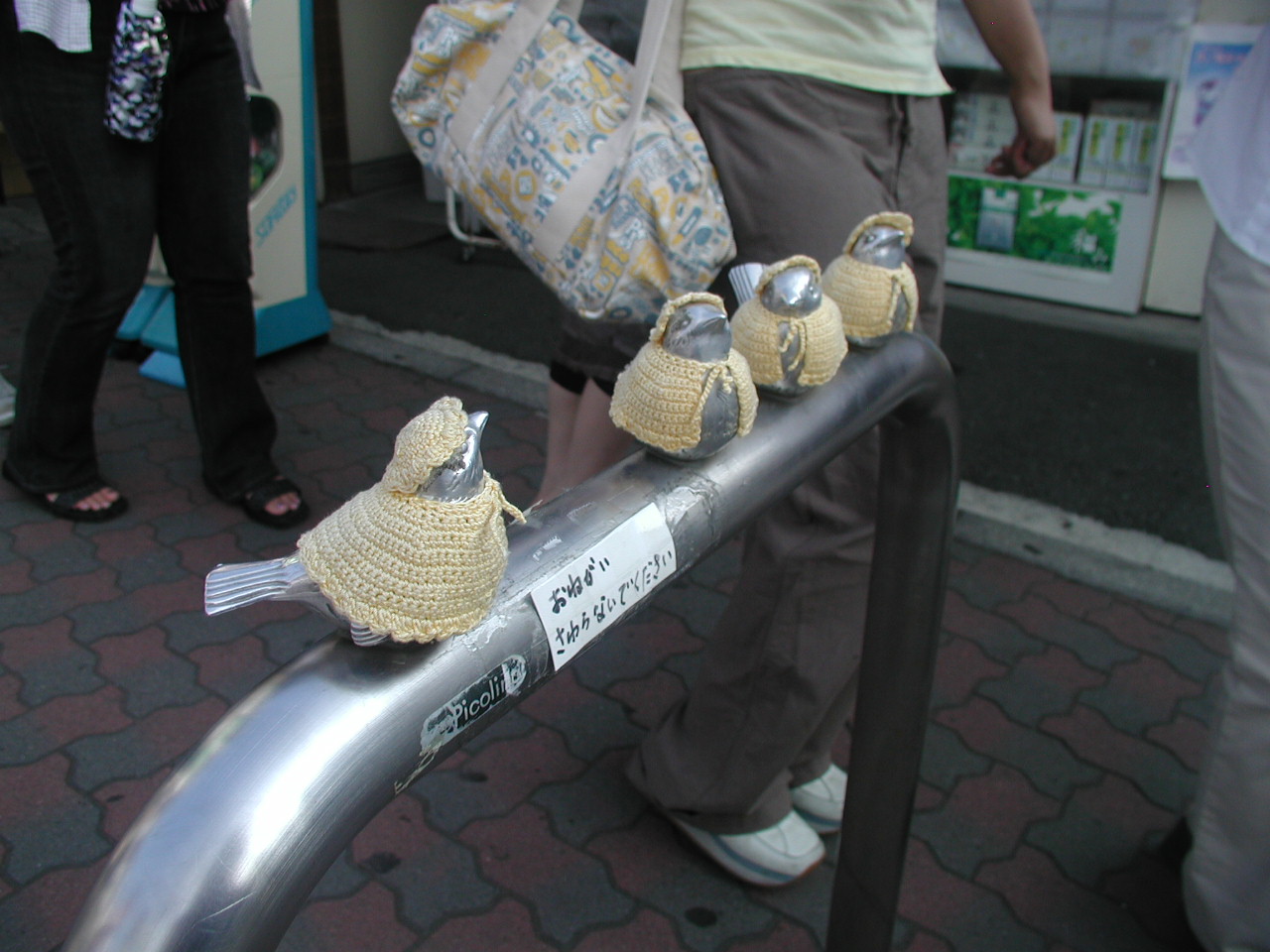 この写真は江ノ島電鉄線の江ノ島駅の前の柵に乗っかっていた(つながっている?)小鳥の鉄でできた銅像です(鉄でできてたら銅像って言わないじゃないか・・)。この通り洋服がかかっています。触って破けたりしたら一大事ですよね。